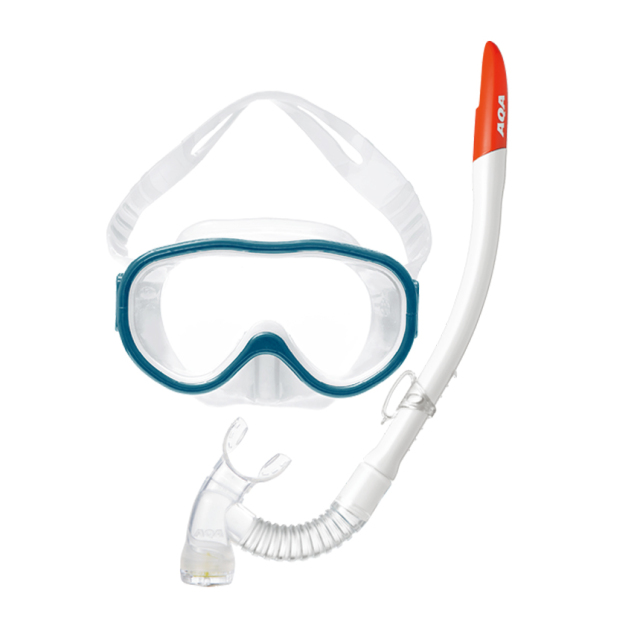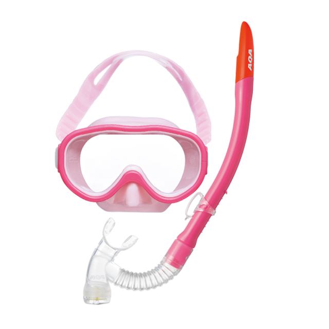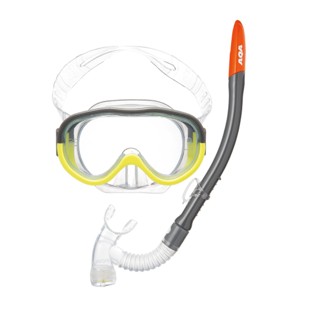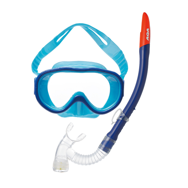 AQA(エーキューエー)お子様向けスノーケリングセット【4才~9才の子供向け】はポップで可愛らしいカラー展開なのでお子様の好きな色が見つかるはず!目に優しいUVカットのプラスチックレンズ採用し軽量化することでマスクもズレにくく初めてのスノーケリングにぴったりです。